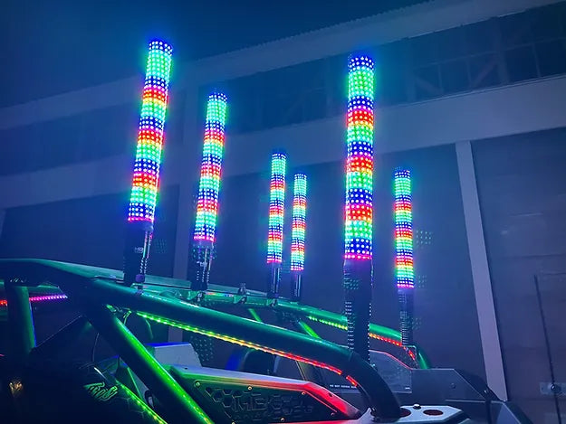 The original Flash Pro 2" thick whip, burst onto the scene and was an instant favorite of dune and trail riders alike. However, we don't stop innovating just because we designed and released the first and the best 2" thick whip on the market, we keep it moving and designed the new V2. The V2 is bigger, it is brighter, it is lighter. It is improved across the board. We've reduced the weight by over a half a pound, we've added 2 more inches in length, and last but not least, added nearly 200 LED's per whip with a total of 600 LEDs per whip! Our whip bases feature a hybrid of stainless steel cores to improve strength and billet annodized outer mount to keep it looking clean.
